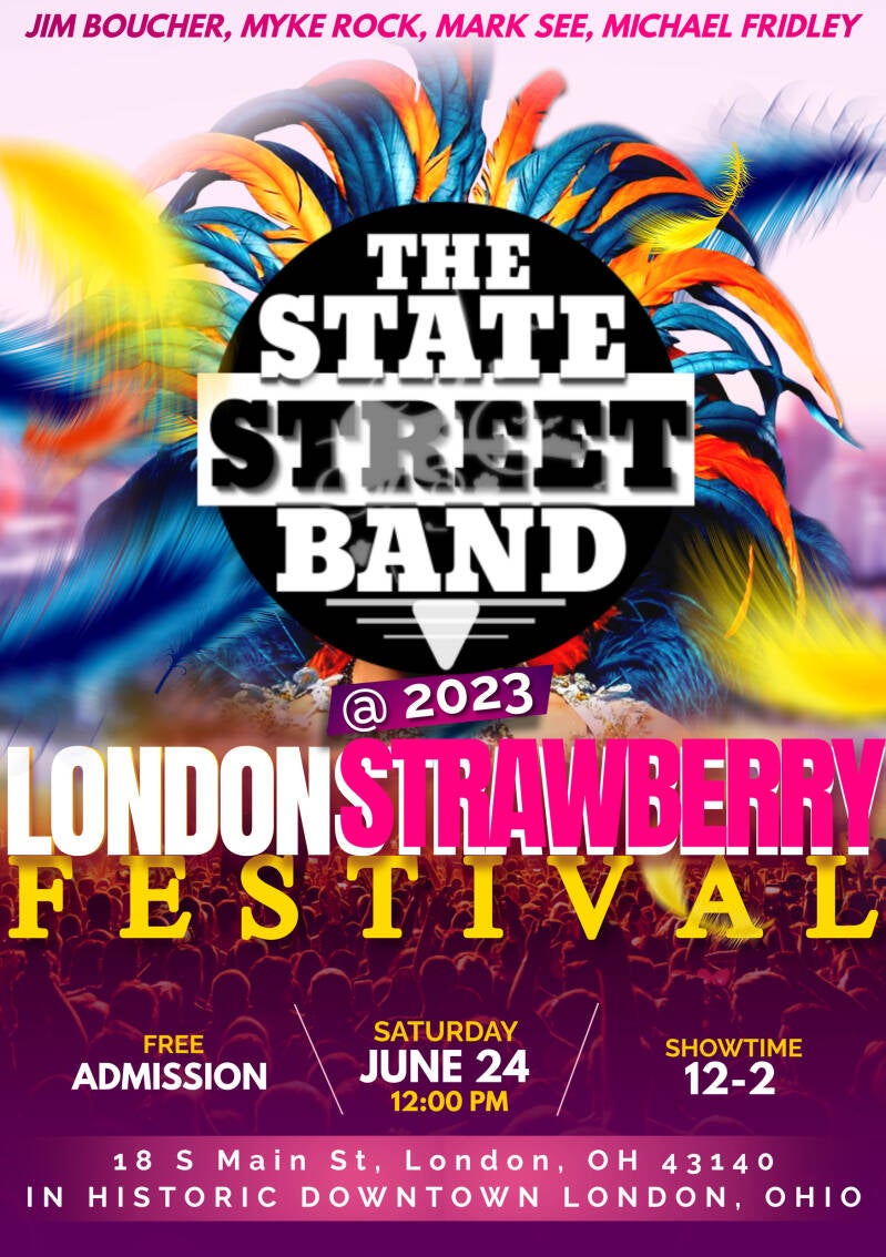 Jim Boucher, Myke Rock, Mark See and Michael Fridley, The State Street Band perform at the London Strawberry Festival (London Strawberry Festival: 18 S. Main Street, London, Ohio 43140) Saturday, June 24 at 12:00pm! A super fun classic rock show awaits lucky attendees on this unique afternoon concert!