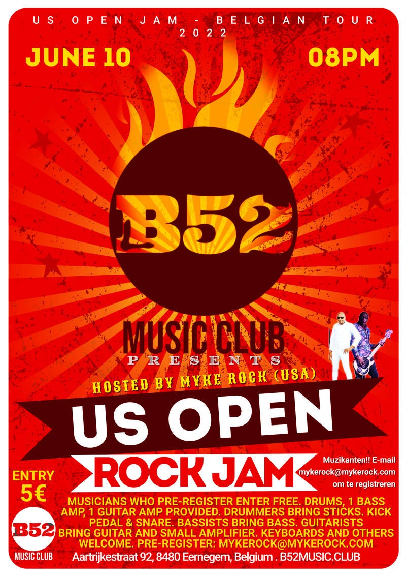 Myke Rock and Stan The Man come from the U.S. to tour Belgium with the band Cat String Theory, May 27 - June 4, but from June 5 - June 12 Myke and Stan team up with Belgian guitarists to host US Open Jams. On Friday, June 10, the US Open Rock Jam takes place at the B52 music club (Aartrijkestraat 92, 8480 Eernegem, Belgium - http://www.b52music.club) beginning at 8:00. There is a $5 cover charge and musicians who pre-register (email mykerock@mykerock.com, See below) enter free. Myke Rock lived in Belgium for a couple years until the pandemic shut things down. During his time here the bassist performed and jammed with over 100 musicians and he hopes to see and jam with many of them at the B52. All musicians and rock music fans are welcome to join in the US Open Rock Jam. Although Pre-Registration is suggested, musicians can come and sign up between 7:30 and 8:00, if spots are still available.
