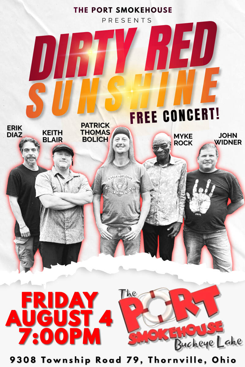 Dirty Red Sunshine (Patrick Thomas Bolich, Myke Rock, Erik Diaz, Keith Blair, John Widner) makes their Buckeye Lake, Ohio debut, Friday, August 4, 2023 at the Port Smokehouse (https://www.facebook.com/port.smokehouse, https://portsmokehousebuckeyelake.com: 9308 Township Road 79, Thornville, Ohio, 740-246-5000), beginning at 7:30pm. Essential and critical rock permeates Buckeye Lake on this night. Join bandleader, lead vocalist and guitarist Patrick Thomas Bolich of Hott Lucy, former Hot Tuna drummer, independent producer and engineer Erik Diaz, Toast guitarist John Widner, keyboardist extraodinaire Keith Blair and former Willie Phoenix, Ray Fuller and the Bluesrockers, Belgian recording artist Kloot Per W, and Jamal Thomas (SOS Band, Maceo Parker) bassist Myke Rock for a special night of top rock-n-roll! Free entry. Visit the band's Facebook Page for photos, video and more! https://www.facebook.com/profile.php?id=100092027552501