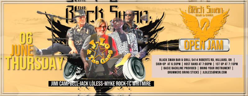 Join J-Lo & The Gang (Jack Loless, James Campbell, Myke Rock andTC Whitmire) for a fun night of super jams Thursday, June 6th at the Black Swan Bar & Grill (5414 Roberts Rd, Hilliard, Ohio USA). Sign-up begins at 6:30, the host band plays at 7:00 and the "first up" plays at 7:15. Bring your instrument and jam with us, bring your band or play solo. Contact Jack at jloless@msn.com and check back here for more information.