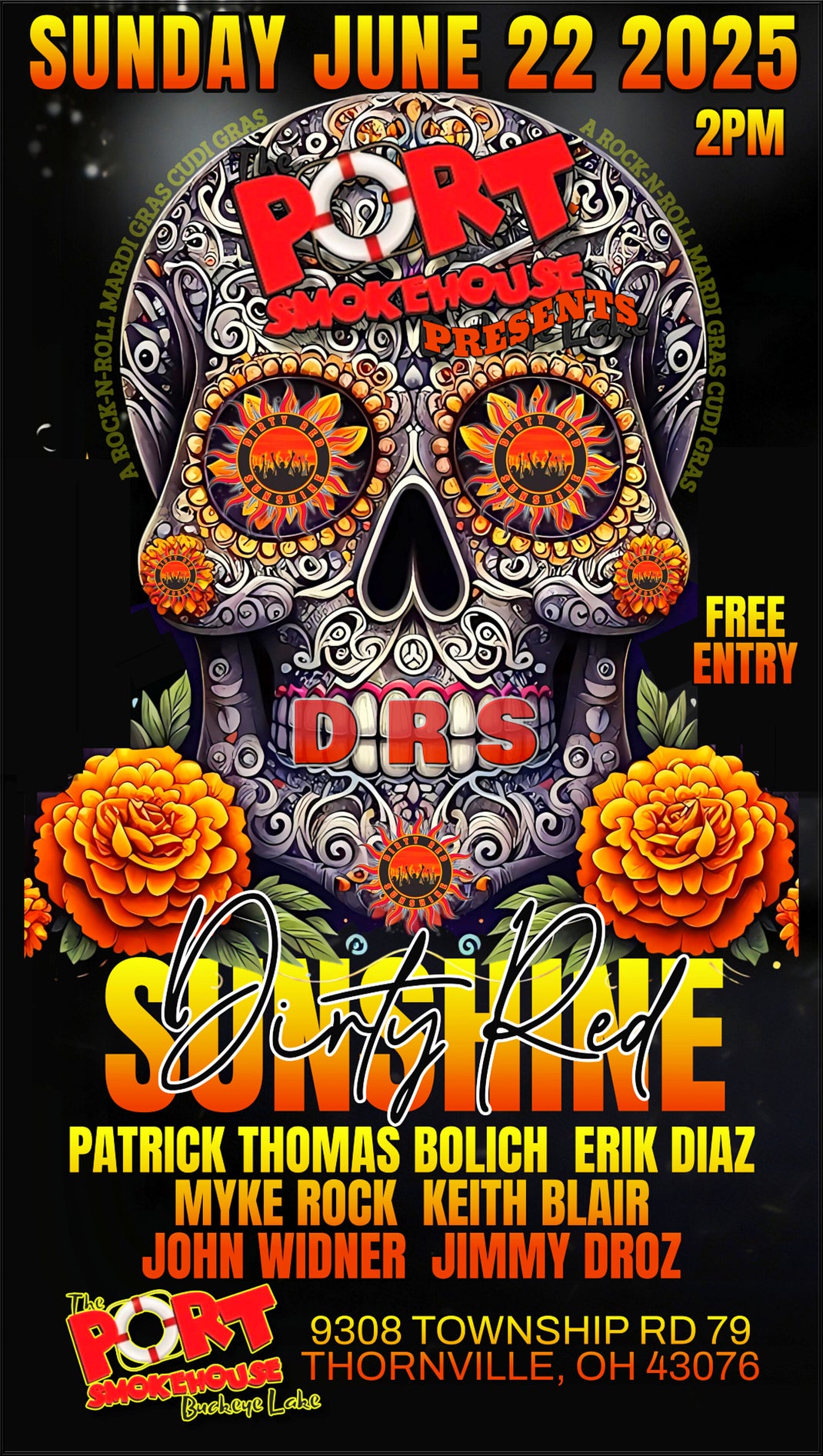 Sunday, June 22, the Port Smokehouse Buckeye Lake, Ohio presents a Sunday afternoon free concert: Dirty Red Sunshine (Patrick Thomas Bolich, Myke Rock, Erik Diaz, Keith Blair, John Widner, Jimmy Droz). DRS, beginning at 2:00 PM (until 6:00 PM) are in-concert at The Port Smokehouse (9308 Township Rd 79, Thornville, Ohio). A free entry event, DRS bring their jam-band, rock classics and original music concert to Buckeye Lake in this special event.
