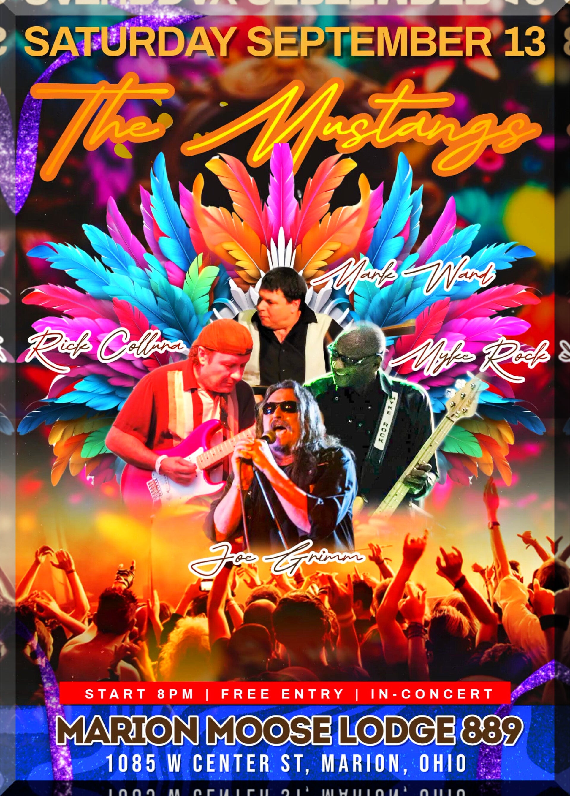 The Mustangs (Joe Grimm, Rick Collura, Mark Ward, Myke Rock) - AMERICANA-ROCK-DANCE-COUNTRY-BLUES Kings, are In-Concert at the Marion Moose Lodge #889 (Marion Moose Lodge 1085 W Center St, Marion, Ohio) Saturday, September 13th, 2025, beginning at 8:00 PM. Admission is free!