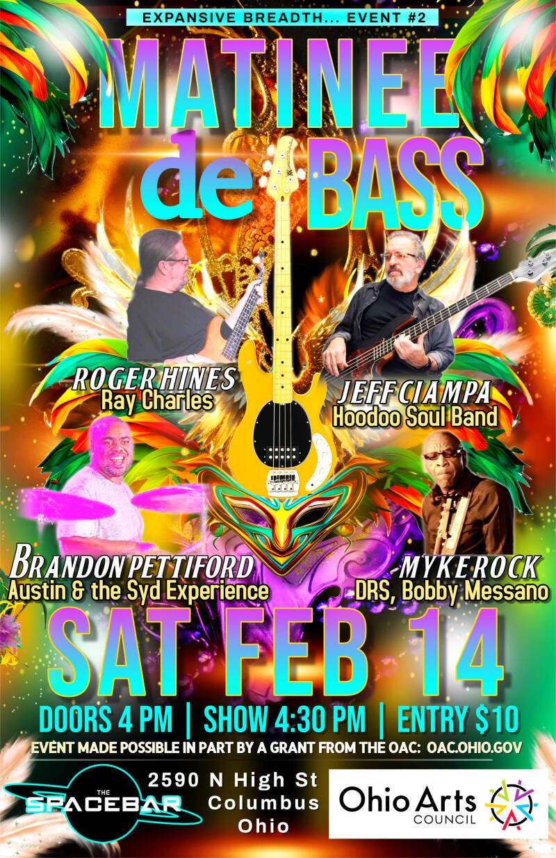 On Saturday, February 14th, 2026, the "Expansive Breadth of Electric Bass Guitar in Action" series presents its 2nd of 4 events at the Spacebar (2590 N High St, Columbus, Ohio: https://www.facebook.com/spacebarcolumbus, https://www.spacebarcolumbus.com), beginning at 4:30 PM. This special Valentine's Day concert is subtitled, Matinee de Bass and features central Ohio bassists Roger Hines (Ray Charles, Diane Schuur, Louie Bellson, Count Basie Orchestra: https://rogerhinesbass.com), Jeffrey Ciampa (Hoodoo Soul Band, Harry Belafonte, Zero One, Popgun, Birdshack: https://jeffreyciampa.com), Myke Rock (Jamal Thomas - SOS Band, Maceo Parker -, Bobby Messano Band, Dirty Red Sunshine), and drummer Brandon Pettiford (Austin and the Syd Experience, Pett Crow, Sean Carney Band: https://soundcloud.com/brandon-pettiford-867083167). With an opening act to be announced. There is a $10.00 entry fee. Please view biographical information on these artists and Ohio Arts Council statement, below.